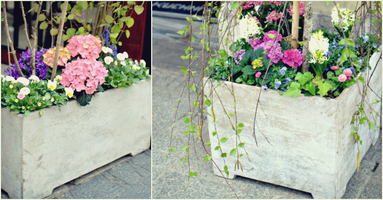 Dziś obejrzymy nasadzenia w plantersach, czyli gabarytowo większych pojemnikach, najczęściej wykonanych z trwałych surowców typu beton, kamień lub drewno, stojących bezpośrednio na ziemi lub wyposażonych w narożne nóżki. Przeznaczone są do wielogatunkowych, piętrowych nasadzeń od drzewek po sezonowe kwiaty. Duży zapas substratu glebowego pozwala na bogatszy skład gatunkowy, ponieważ warunki termiczne i wilgotnościowe w dużych pojemnikach są o niebo lepsze niż w ciasnych skrzyneczkach. Wymienione powyżej materiały zapewniają względną stałość warunków termicznych: nie przemarzają ani nie przegrzewają się gwałtownie, jak w przypadku cienkich pojemników z tworzyw sztucznych.